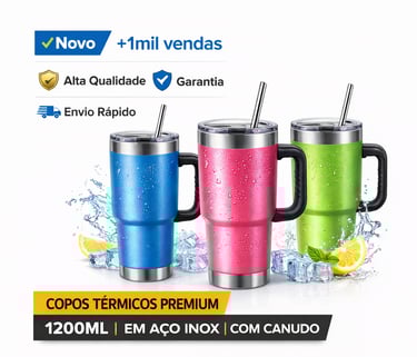 É um copo térmico de alta qualidade fabricado em aço inoxidável 304 (o mesmo usado em utensílios profissionais), com capacidade generosa de 1.200 ml. Vem com tampa rosqueada hermética, alça ergonômica e canudo de inox reutilizável.