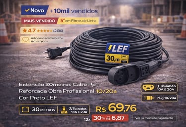 Você está procurando uma extensão elétrica realmente confiável, que aguente o tranco do dia a dia em obras, oficinas ou até em casa com muitos equipamentos? A Extensão 30 Metros Cabo PP Reforçado Profissional 10/20A Preto LEF já vendeu mais de 10 mil unidades, é o mais vendido da categoria e ocupa o 5º lugar entre os filtros de linha mais populares. Com avaliação 4.7 de 5 estrelas (baseada em 2.130 opiniões reais), ela entrega exatamente o que promete: segurança, durabilidade e praticidade.