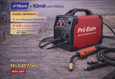 Se você está procurando uma máquina de solda que combine versatilidade, eficiência e durabilidade, a Máquina de Solda Multiprocesso MIG Flex 150A Pró Euro Bivolt é uma opção que merece sua atenção. Com mais de 10 mil unidades vendidas e uma avaliação média de 4.8 estrelas baseada em 7.904 opiniões reais de clientes, ela se destaca como o segundo produto mais vendido na categoria de máquinas de solda. Imagine ter uma ferramenta que resolve suas necessidades de soldagem sem complicações – e o melhor, com um desconto de 47% agora mesmo.