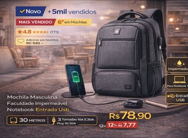 Se você está procurando uma mochila resistente, prática e que realmente facilite o dia a dia de estudos ou trabalho, essa Mochila Masculina Impermeável para Notebook com Entrada USB é uma das opções mais confiáveis do mercado. Com mais de 5 mil unidades vendidas, posição de destaque (6º lugar na categoria Mochilas) e avaliação média 4.8 de 773 clientes reais, ela já conquistou milhares de estudantes e profissionais. Quer ver todos os detalhes e garantir a sua antes que acabe o estoque? Clique abaixo e confira o produto agora.
