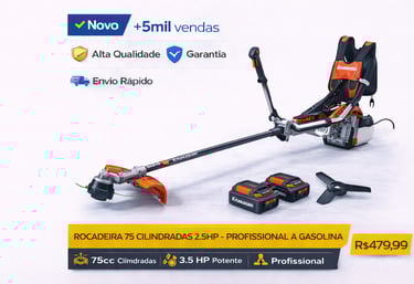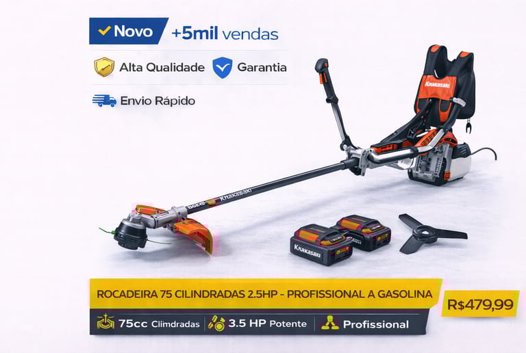 A Roçadeira a Gasolina Knakasaki 75cc 3.5HP é uma máquina profissional de verdade, com potência para trabalhos pesados, construção robusta e preço que cabe no orçamento de quem precisa de equipamento de qualidade sem pagar fortuna.